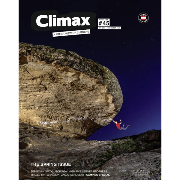 Die neueste Ausgabe vom CLIMAX MAGAZINE #45 ist ab sofort erhältlich. Im Flash Back erzählt Simon Gietl über seine neue Route Blutsbrüder. Weiters gibt es ein Portrait der jungen Leitner Brüder aus Graz. Patxi Usobiaga meint, jede Bewegung ist trainierbar, und so wie er klettert und coacht, kann man das getrost glauben. Ein langer Bericht über Seb Bouin zeigt, was der starke Franzose wirklich drauf hat. Mit unserem Travel-Tipp geht es diesmal nach Granada in Spanien, geschmückt mit coolen Bildern von David Munilla. Dies und vieles mehr im neuen Climax Magazine #45.