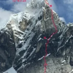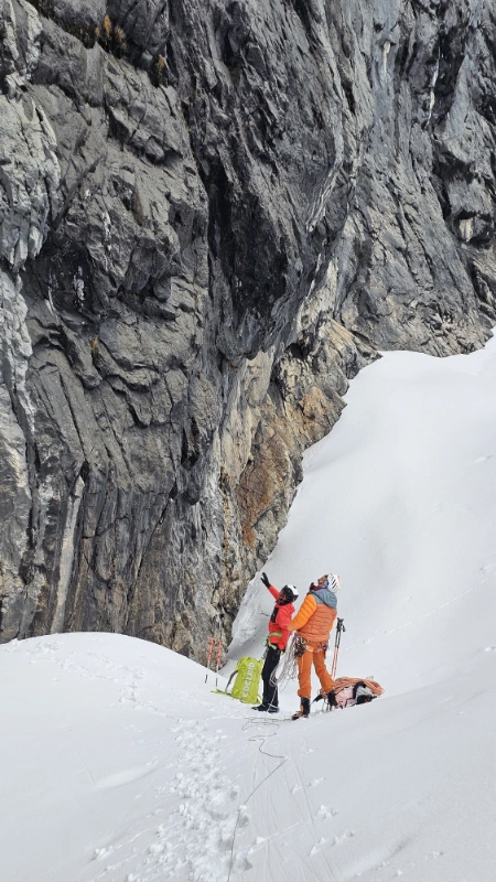 Nach zwei Biwaks in der Wand erreichten Arnold, Huber und Gietl am 15. Juli um 9:15 Uhr den Ostgipfel (GPS: 6028 m). Der Hauptgipfel wurde aufgrund von sehr schlechten Schneeverhältnissen und hohem objektiven Risiko nicht mehr angesteuert – eine klare sicherheitsbasierte Entscheidung.