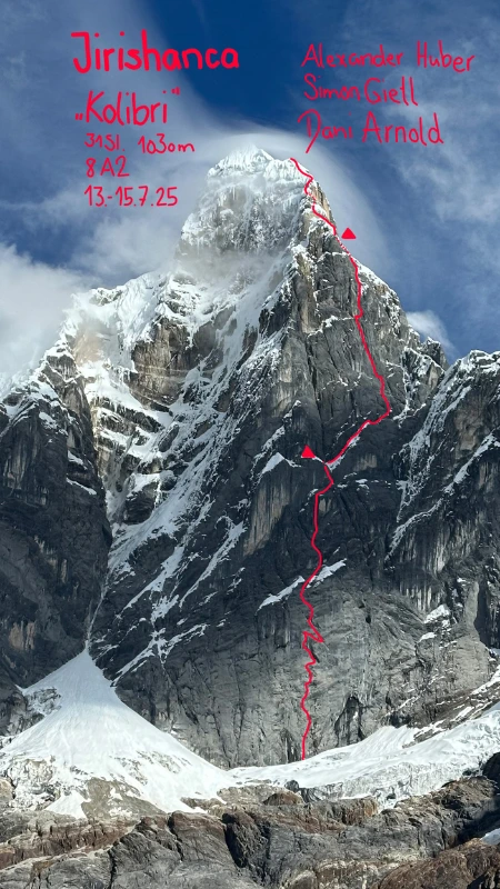 Am Jirishanca (6094 m) in der Cordillera Huayhuash eröffneten Dani Arnold, Alexander Huber und Simon Gietl vom 13.-15. Juli eine neue Route durch die Ostwand – eine der markantesten und steilsten Wände der Anden. Die Linie mit ihren 31 Seillängen auf 1030 Höhenmeter trägt den Namen „Kolibri“. Der Charakter: steile, technisch fordernde Kletterei in kompaktem Kalk, kombiniert mit alpinem Ernst und klassischer Linienwahl.