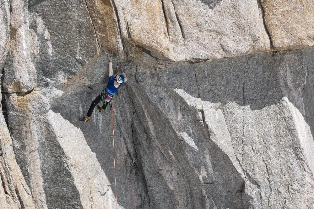 Ich bin nicht dafür gemacht, in der Sonne zu klettern. Aber wer hätte gedacht, dass es in 3.500 m Höhe so heiß werden kann? Ich machte ein Nickerchen, hing in meinem Klettergurt und lehnte meinen Kopf an den Haulbag. Als ich aufwachte, lag die Seillänge im Schatten. Es war fast 15 Uhr, und es sah nicht so aus, als würde ich es wie geplant an einem Tag bis zum Gipfel schaffen. Ich bereitete mein Setup vor und weiter ging es.
